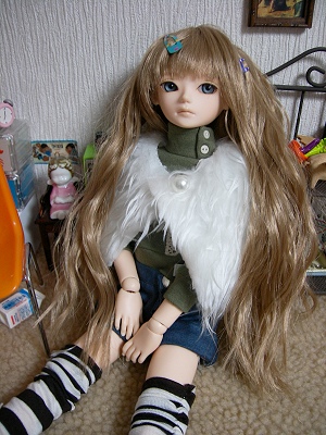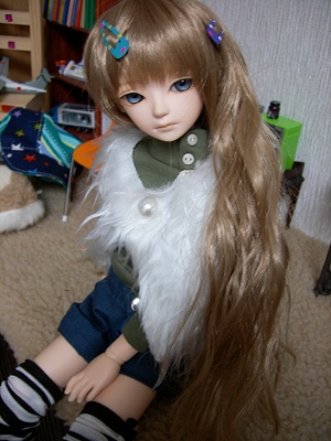 上に羽織っているのは、ボア生地を簡単に縫い合わせただけです。ベストみたいな形で、腕を通す穴も開いています。