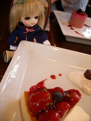 さて、お次はケーキです。苺のタルトです。お皿の右の上(?)にあるのは生クリームとチョコです。合わせて食べるとまたおいしかったですv