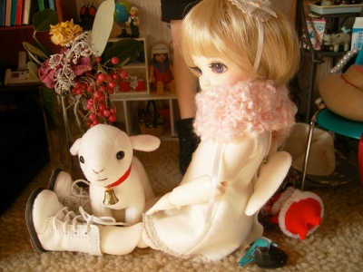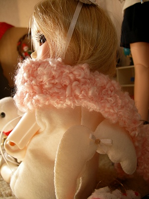 まずは天使服。昨日、急遽マフラーを編んで見ました。このふわふわ感があるかなーと思って。しかしぐちゃマフラー(目の数が合っていないぐちゃぐちゃなマフラー)なので近くでは見れたものじゃありません。