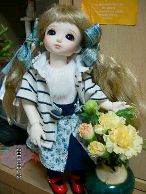 お花は本物です。小さなブーケでリーズナブル。いっつも見ながらほしいなーと思っていたんですが、最近はもう電車も使わないし、見かけなくなっちゃって。お花とおにんぎょうって似合いますね~v