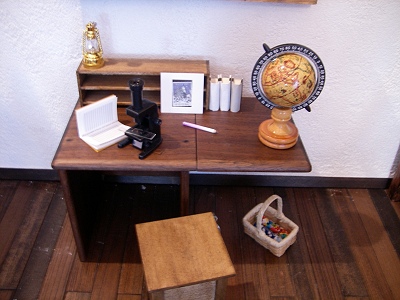 あれ、肝心のベッドを写すのを忘れている…。お人形さんを撮ったものにあるのでご容赦を~。こちらはカフェ内の一番奥にあり、2段ベッドに挟まれて置かれていた勉強机(?)。この上には大きな窓がありました。雰囲気たっぷり。