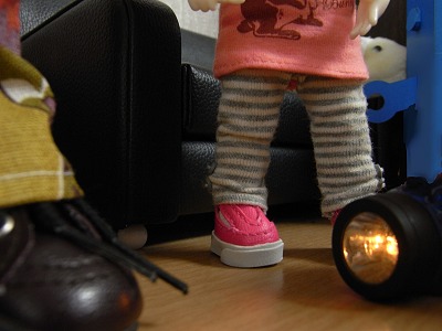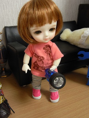 この懐中電灯は、100均で見つけました。一番長いとこで3.5センチほど。持ち手は葛野(LaTi黄Coco)以下しか入りませんでした。プチアイもAngeも指の太さからみて入るには入るんですが、指を入れるスペース(持ち手の穴)が狭く、指の開き具合がじゃまして持つことはできませんでした。TFは指の太さからして入りません。
