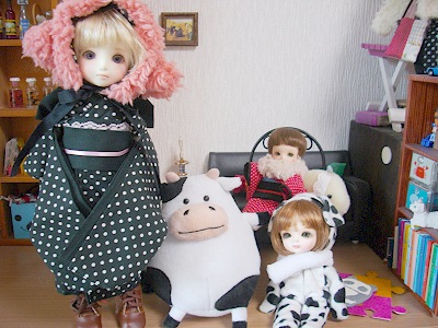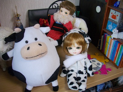 最初はひつじフードをかぶってました。でも未年ってあるんですよねー。その時にまた(何年後だよ)。葛野(LaTi黄Coco)が着ているのは実は(?)牛がらではないんです。ダルメシアンなんですが似ているので着せちゃいました(笑)