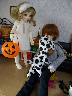 衣装ですが、てん子さん(PAIエリエル)が着ているのは、去年の冬にえりさまからいただいた天使服。ハロウィンで使うんだ! とめっさ意気込んでました。ありがとうございました!(再)葛野(LaTi黄Coco)が着ているのはおまけで来たデフォ(?)服。牛じゃないですよ。ダルメシアンですよ。