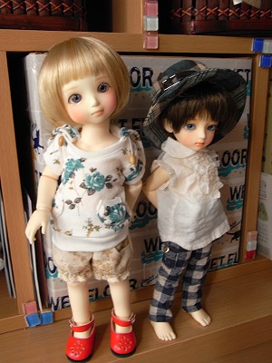 ちびサイズはてん子さん(PAIエリエル)の着ているフードつきのと碓一助(Angeウリ)の履いているパンツ。あとかぶっている帽子。チェックとか小花柄とか弱いわ…。