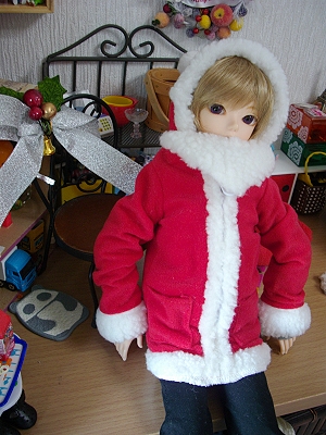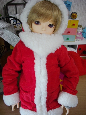 このサンタ服は「ミュニデ」というペットボトルケースでした。底をぶちぶち取り払い、袖部分についていた部品を外し、内部の保冷シート(?)に穴を開けました。某ブログさんで以前他の種類でやっていたのでウチでも! と。ちょうど安売りだったので…。袖部分が細く、長いですかね。下に長袖を着ていて写真のような感じになってます。許容範囲です。でも半袖とかで着ればよかった…。フードもかぶれちゃったので感動しました。加工もそこまで大変じゃなかったですし。